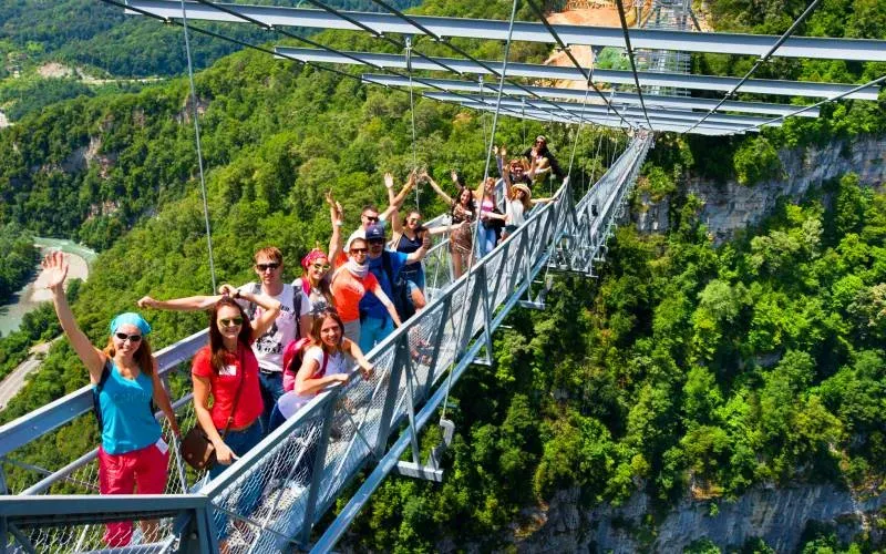 Скайпарк – это сочинский прототип Новой Зеландии. Центральное место занимает подвесной мост на высоте 170 метров. Мост достаточно узкий, поэтому не стоит брать с собой сумки и рюкзаки. Их можно оставить в специально предназначенной камере хранения. Виды с моста просто потрясающие, можно сделать массу прекрасных фотографий природы. Главное – выбрать не очень ветреный день для посещения. Также есть смотровая площадка, с которой хорошо видно Ахтырское ущелье. Можно посетить адреналиновые аттракционы, а также прыгнуть с моста с тарзанкой. Перед мостом есть тоннель с расположенным в нём музеем, раскрывающим историю создание Скайпарка.